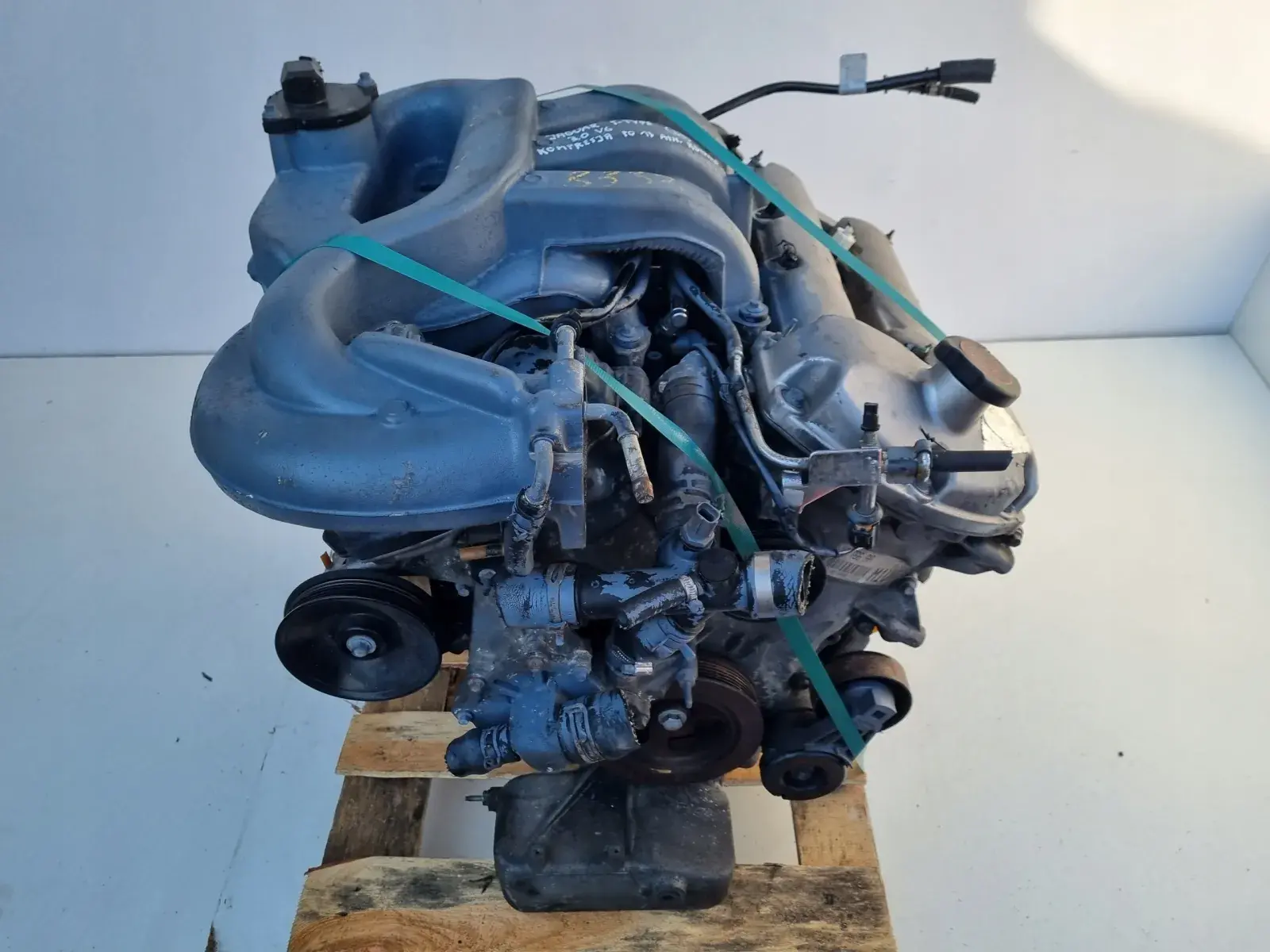 Silnik sprzedajemy w komplecie z pełnym osprzętem widocznym na zdjęciach takim jak komplet wtryskiwaczy z listwą wtryskową, kolektor ssący, koło pasowe wału, kolektory wydechowe, obudowa termostatu, pompa wody, koło zamachowe, czujniki faz rozrządu, obudowa filtra oleju, przewody, czujniki itp