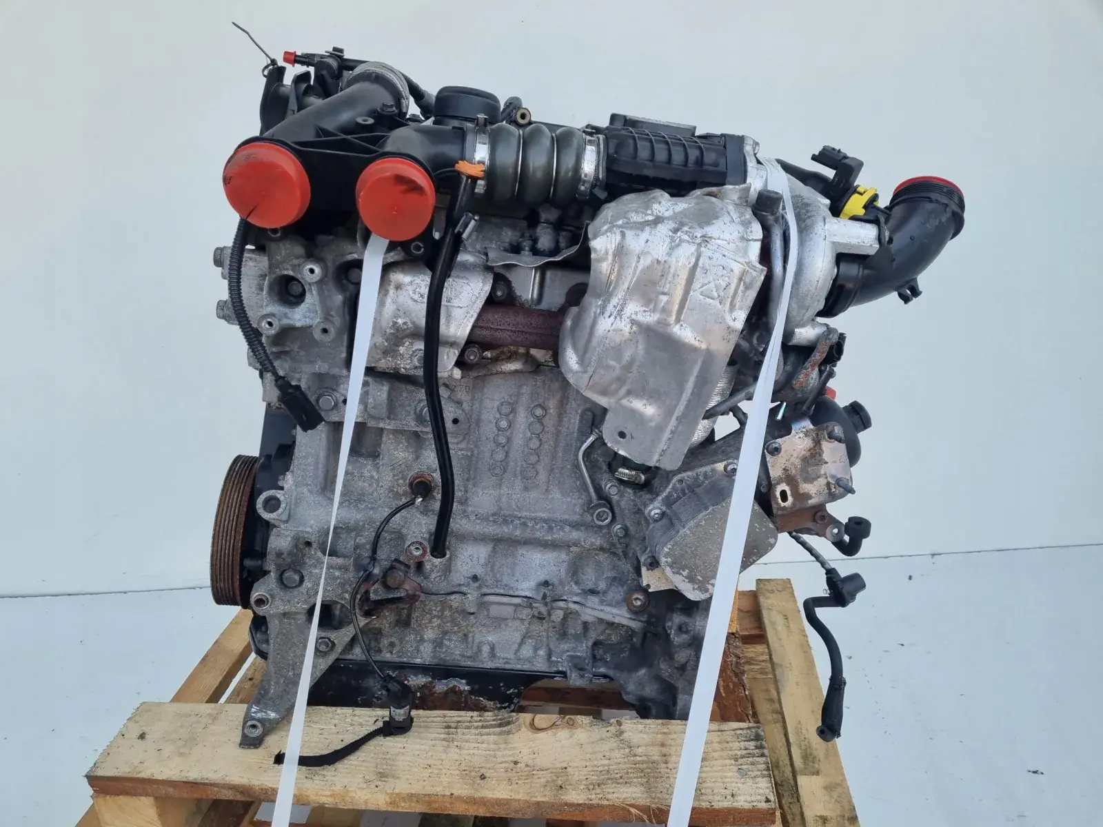 Silnik sprzedajemy w komplecie z pełnym osprzętem widocznym na zdjęciach takim jak układ paliwowy czyli komplet wtryskiwaczy, listwa wtryskowa z czujnikami, przewody paliwowe, pompa paliwa, kolektor ssący, kolektor wydechowy z turbosprężarką, podstawa alternatora, koło pasowe wału, chłodniczka spalin, pompa vacum, obudowa termostatu, przewody, czujniki itp